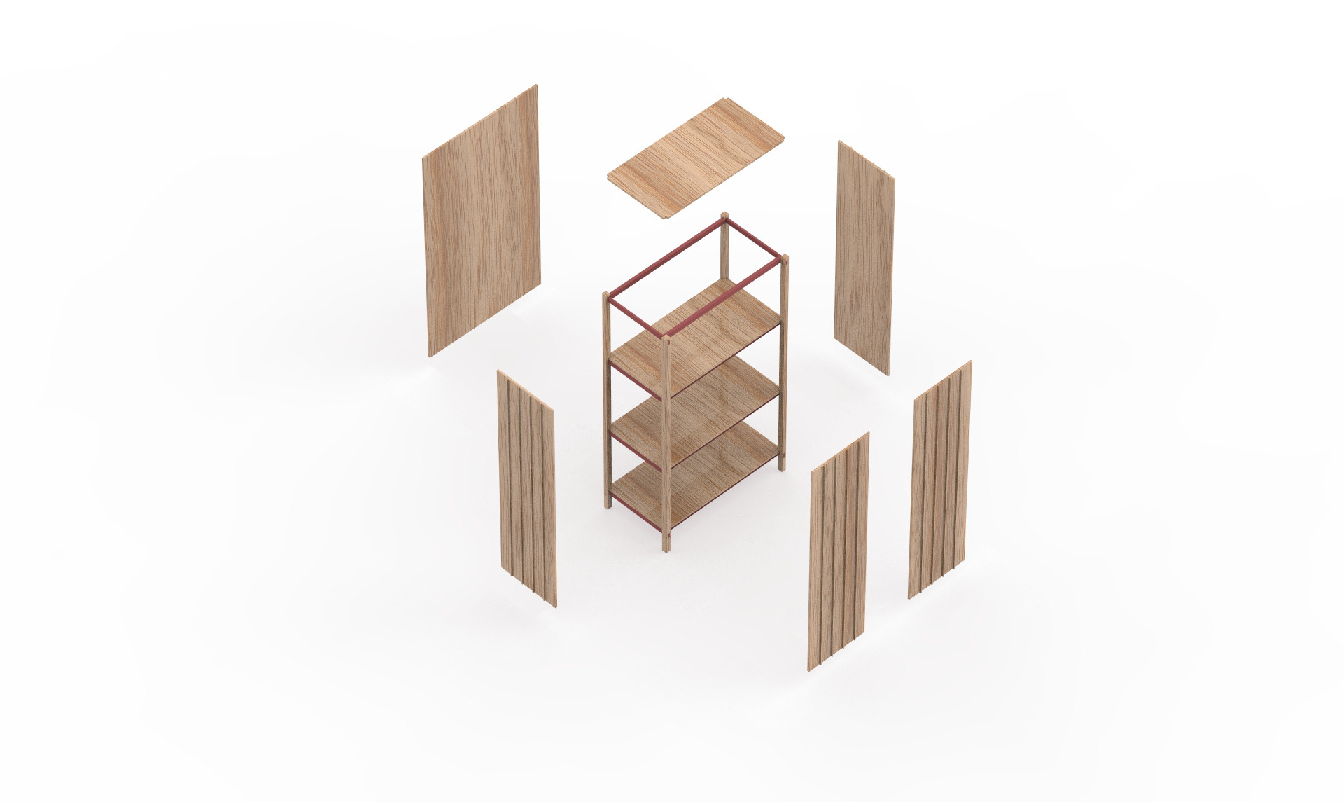 Several versions are designed based on the same core structure. A totally open shelf, semi-closed cabinet and a full door option. These alternatives can be upgraded any time, making the cabinet a modular system piece.