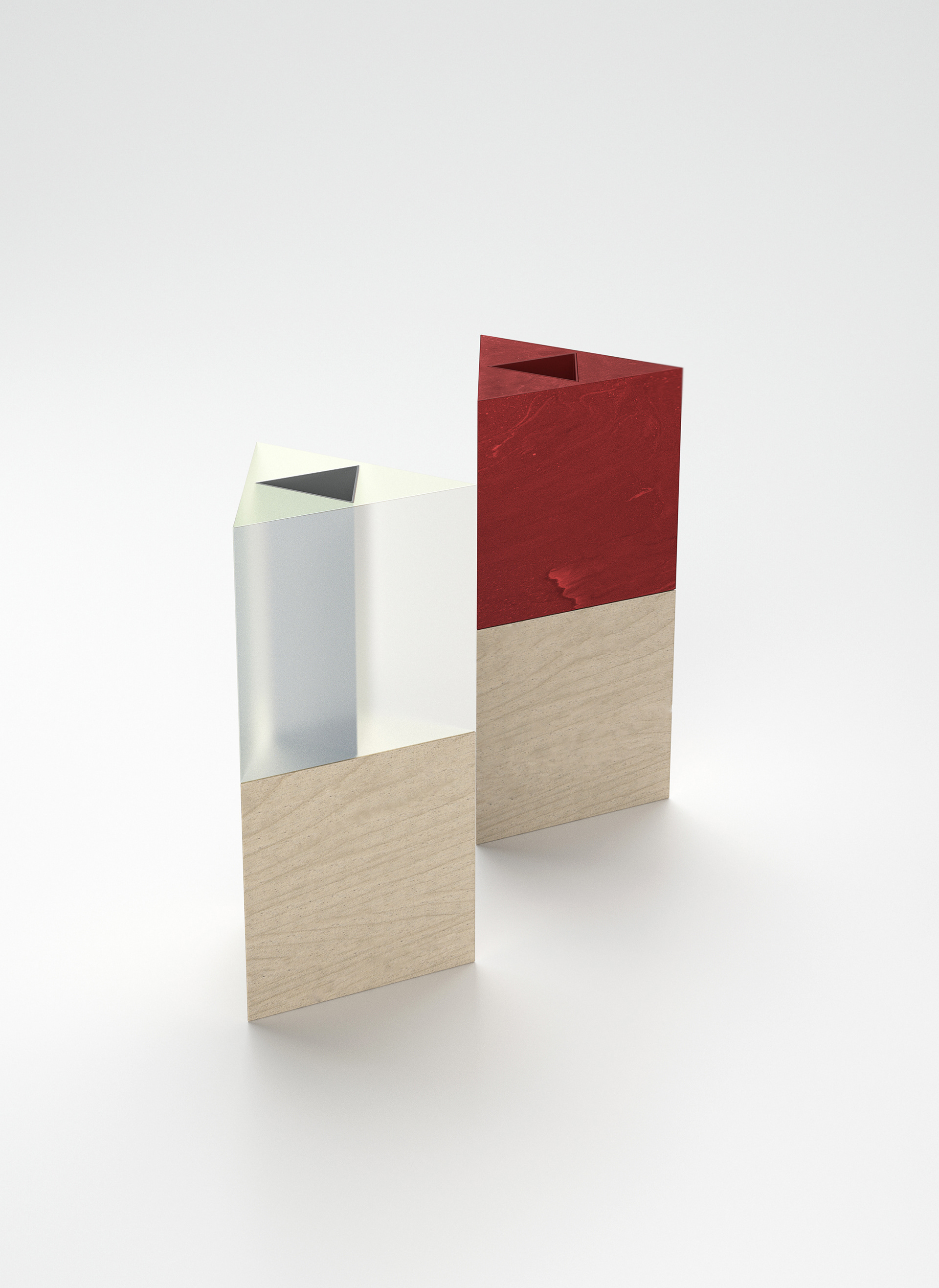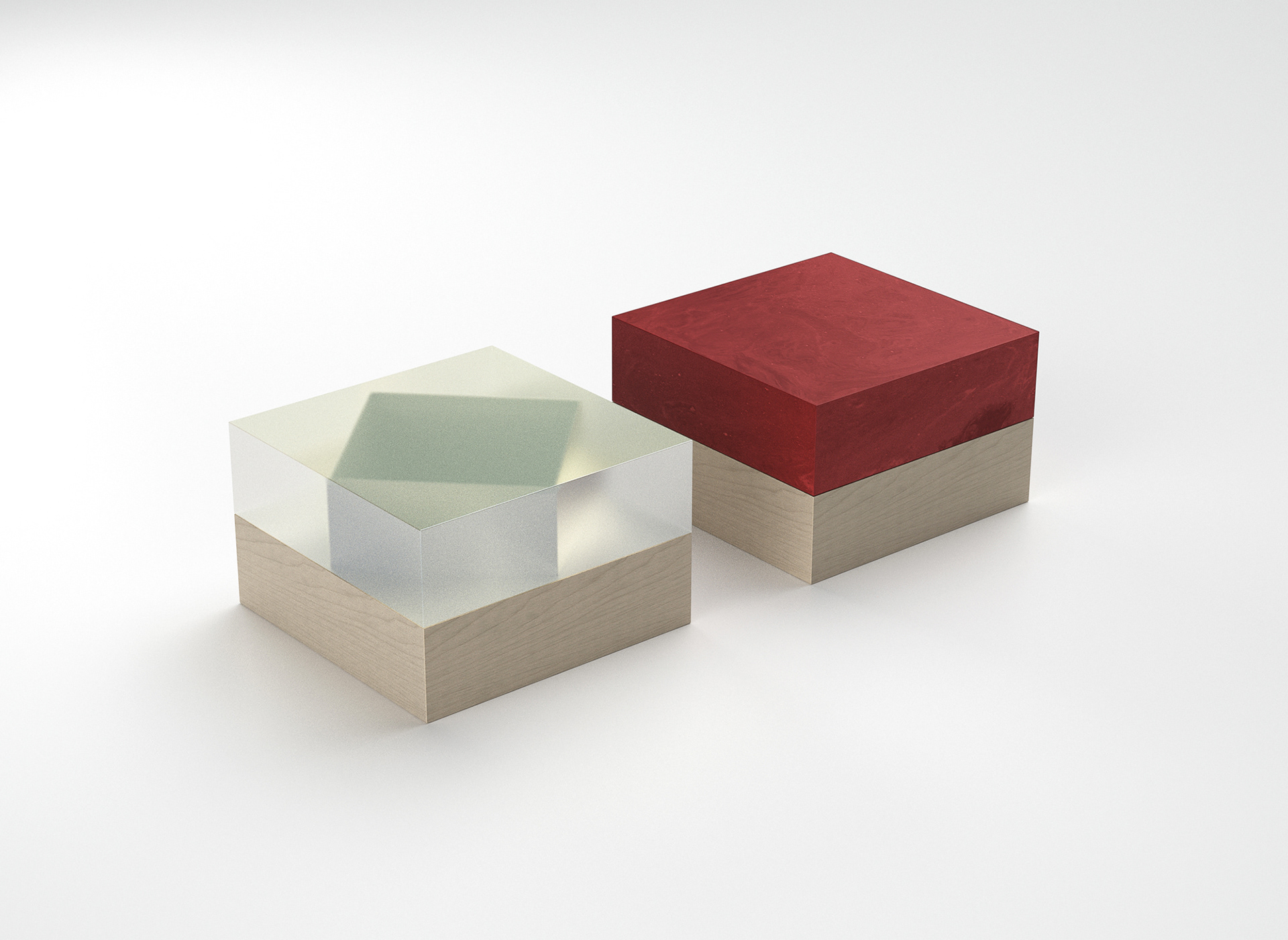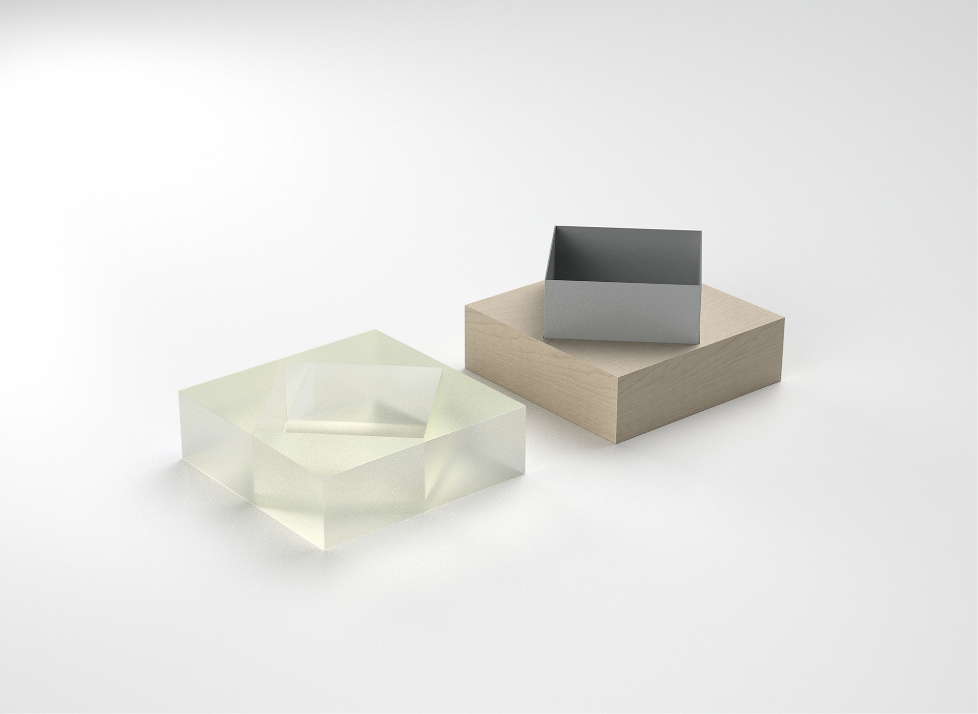 “SHADES” is a collection of boxes and vases that plays with the intersection of geometric shapes, the contrast of different materials and finishes, creating a touch sensation and a visual volumetric game. Each item is composed by three elements: two identical pieces, one made of ash and the other of polyurethane mixed with minerals, both contain a frame inside which is made of painted metal. Company: Cotto